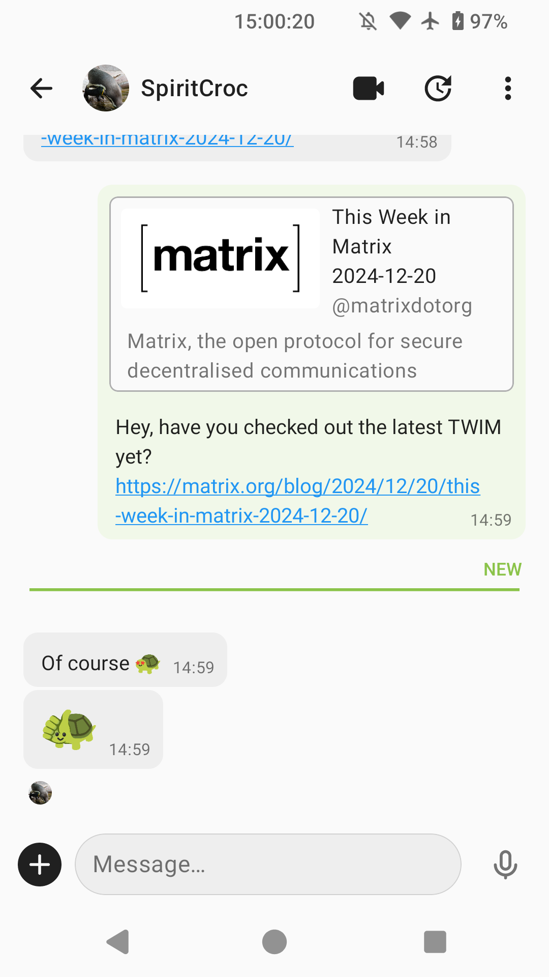 27.01.2025 00:00 β This Week in Matrix β ThibThis week we tried publishing TWIM on a Monday, but people seem to enjoy reading their Matrix news during the weekend. We will get back to publishing TWIM on Fridays!