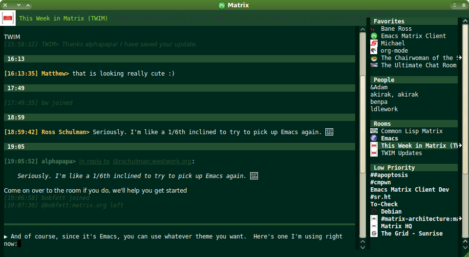 matrix-client.el gained more room sorting options and a /priority command to set room priority. It also includes a workaround for a Google Chrome drag-and-drop bug on Linux, so now Chrome users can drag-and-drop URLs, files, and images directly into room buffers to upload them.