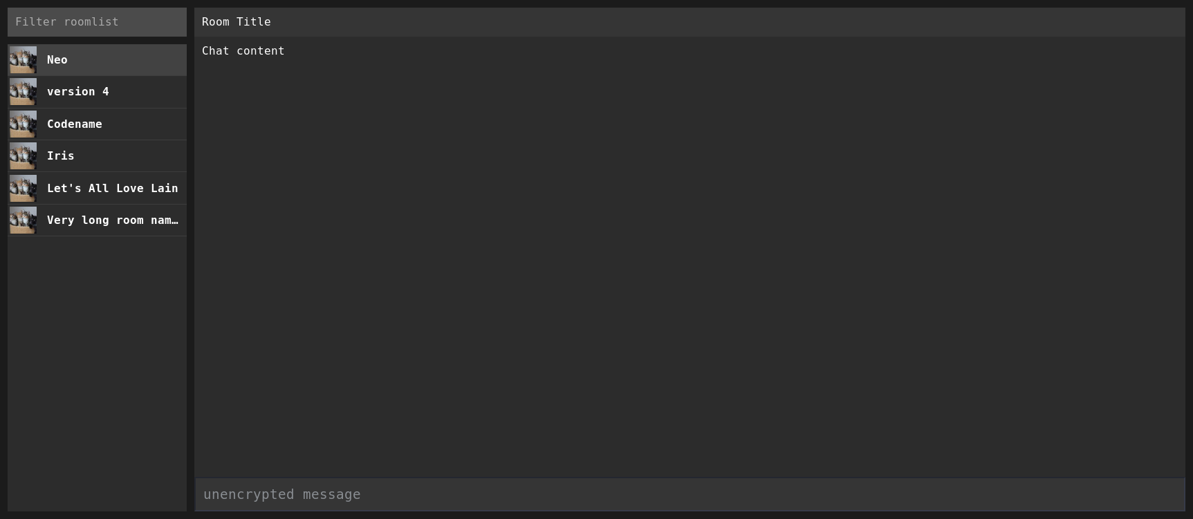 Neo v4: Iris is coming up, focusing on design first. It will be based on React, and the matrix js sdk I didn't plan ahead enough with old Neo (v3), so it became a bit of a clobbered togeather mess, which I'm trying to prevent this time around https://git.lain.haus/f0x/iris