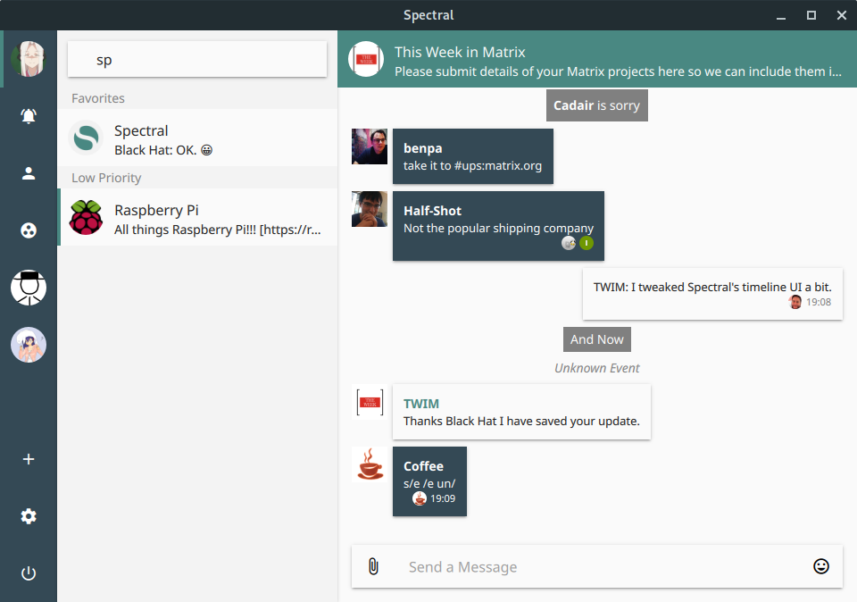 libQMatrixClient is nearing its release 0.4.0, with low-level support of CS API (coincidentally) 0.4.0 added this week. Another very useful addition is caching avatar images to the disk, not only in memory, relieving the network from dozens of extra requests when a client powered by the library is restarted. All thanks for the avatar caching PR go to Black Hat!