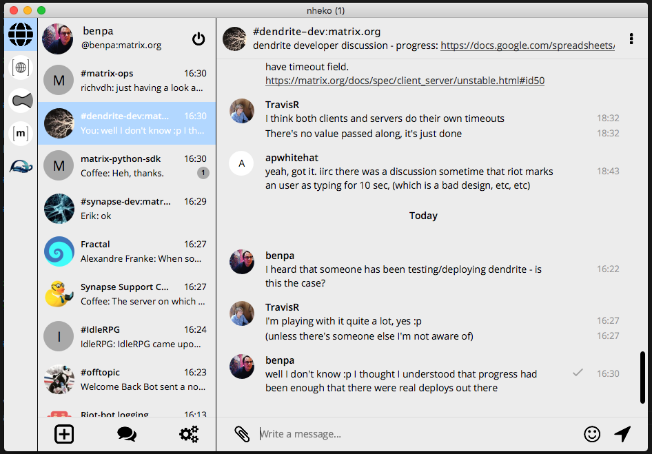 nheko 0.5.1 is out, and it's great! Get a version for your platform from bintray.com. I've been using it for the last week or so (on macOS) and found it very stable and usable. mujx commented that "highlights were encryption support & desktop notifications on all platforms", but you can get much more thorough notes from the release notes.
